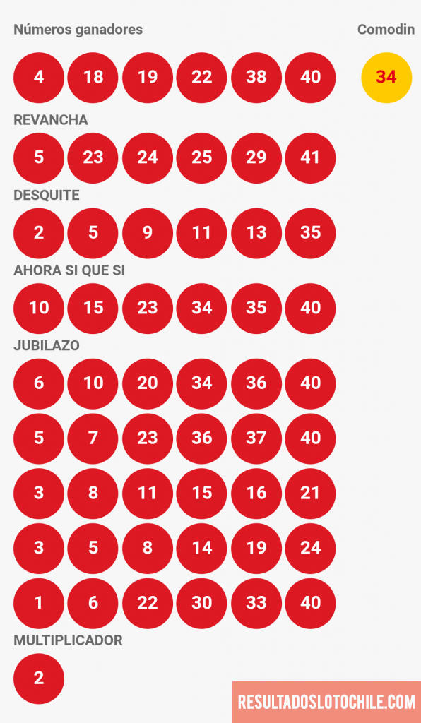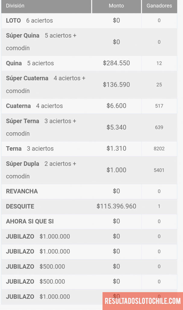 Buenas noches, a continuacion les presentamos los resultados de este sorteo del Loto Chile.